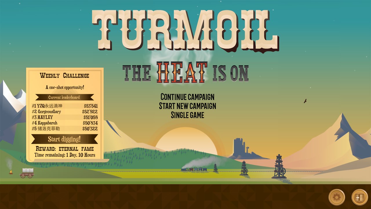 Turmoil предлагает пользователям сыграть в очаровательную ироничную пародию на симулятор по мотивам нефтяной лихорадки XIX века в Северной Америке. Ощутите вкус «лихорадки» и конкуренцию того времени, двигаясь к тому, чтобы стать успешным нефтепромышленником. По мере того как вы зарабатываете деньги, добывая и продавая нефть, город будет расти вместе с вами.