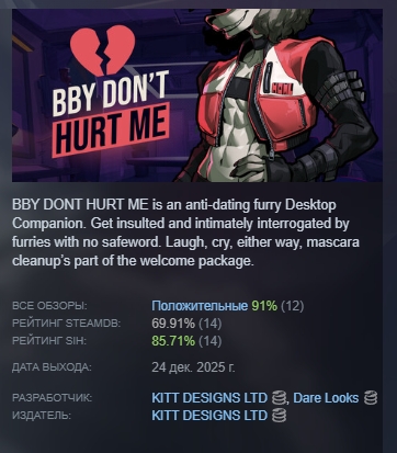 BBY DONT HURT ME — это настольное приложение для фурри, направленное против знакомств. Вас будут оскорблять и допрашивать фурри без стоп-слова. Смейтесь, плачьте — в любом случае, удаление следов туши входит в приветственный пакет.