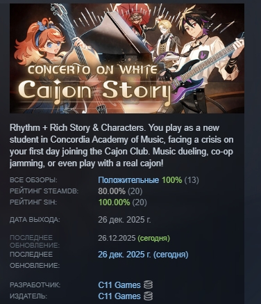 Ритм + насыщенный сюжет и персонажи. Вы играете за нового студента Музыкальной академии Конкордия, который сталкивается с кризисом в свой первый день в клубе кахонов. Музыкальные дуэли, совместные джемы или даже игра на настоящем кахоне!