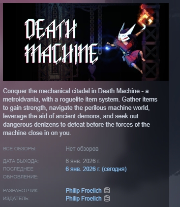 Завоюйте механическую цитадель в Death Machine — метроидвании с системой предметов в стиле roguelite. Собирайте предметы, чтобы набрать силу, перемещайтесь по опасному миру машин, используйте помощь древних демонов и ищите опасных обитателей, которых нужно победить, прежде чем силы машин набросятся на вас.