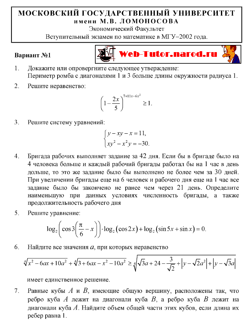 Экономический Факультет МГУ. Задачи вступительного экзамена по Математике для абитуриентов - 2002 год.