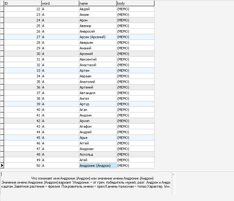 База данных состоит из двух таблиц male и female, в которых разделены мужские и женские имена (910 имён). Каждая строка таблицы состоит из указания на буквку имени, само имя и его толкование. Покупая товар, Вы получаете архив с файлом sql - дампом базы. Размер базы - 6 мб, кодировка utf-8.
