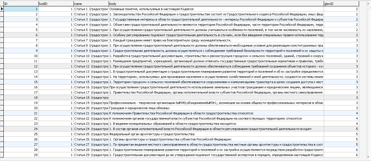 В база три таблицы. Одна с перечислением названий кодексов, другая с перечислением глав и указанием на кодекс, из которого эта глава, и третяя - сами статьи с указанием на главу и кодекс с названием и содержанием статьи.