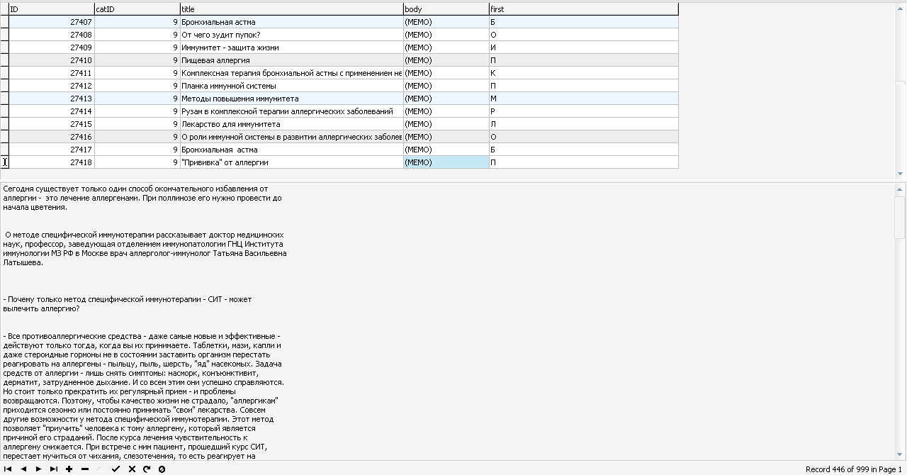MySQl dump базы данных медицинских статей и описаний болезней. В базе представлено 5656 медицинских статей из разных источников и 396 описаний симптомов болезней и способов их лечения.