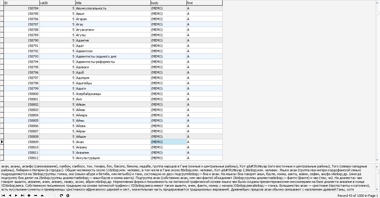 MySQL база данных энциклопедия «Народы и религии мира». Энциклопедии включает 1262 статьи из раздела «Народы мира», 490 статей из раздела «Религии мира», 125 статей из словаре этнологических понятий, 754 терминов из этнографического глоссария. Всего 2631 статья.