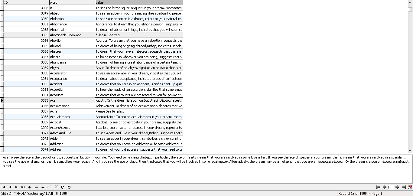 БАЗА данных толкования снов в MySQL, состоящая из 2174 толкований снов на английском языке.