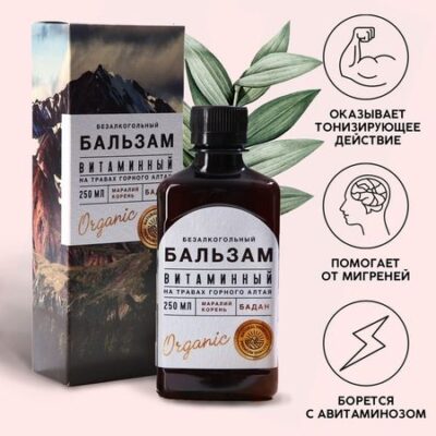 ПРИ ОФОРМЛЕНИИ ЗАКАЗА, ПРОСИМ ЗАПРАШИВАТЬ АКТУАЛЬНЫЕ СРОКИ ГОДНОСТИ У МЕНЕДЖЕРАБальзам на травах горного АлтаяПовышает работоспособность, помогает избавиться от физической и психологической усталости, хорошее укрепляющее средство для ослабленных после болезни людей, активизирует защитные силы организмаСостав: шиповник, черноплодная рябина, облепиха, смородина, малина, маралий корень, земляника, бадан, крапиваСрок годности: 24 месяцаОбъем: 250 мл