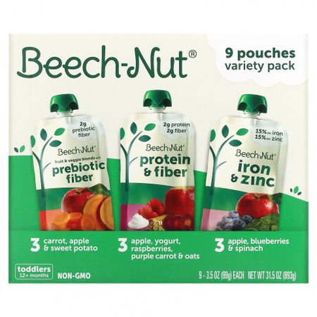 15% суточной нормы железа15% суточной нормы цинкаСмесь фруктов и овощейПреимущества железа и цинка для вашего малыша: Железо помогает поддерживать неврологическое развитие * Цинк помогает поддерживать рост и иммунную функцию * * Рекомендации USDA по питанию для американцев на 2020–2025 годы Ингредиенты Морковью, Apple and Sweet Potato: Carrot, яблоко, батат, вода, клетчатка из корня цикория, лимонная кислота.Яблоком, Для йогурта, Малина, Purple Carrot and Oats: Apple, йогурт из цельного молока (пастеризованное цельное молоко, обезжиренное сухое молоко), вода, малина, фиолетовая морковь, цельнозерновая овсяная мука, концентрат сывороточного протеина, клетчатка из корня цикория, лимонная кислота. Содержит пшеницу, молоко.Яблоком, Blueberries and Spinach: Apple, голубика, шпинат, вода, витаминиnbsp,С (аскорбиновая кислота), лимонная кислота, пирофосфат железа (железо), моногидрат сульфата цинка. Пищевая ценностьРазмер порции: 1 пакетик (99 г)Порций в упаковке: 9