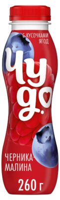 Йогурт питьевой фруктовый со вкусом Черника-малина 1,9% в формате 260г — кисломолочный продукт на основе натурального молока с отборными кусочками ягод.