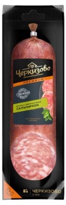 Сырокопченая колбаса Сальчичон от ЧЕРКИЗОВО ПРЕМИУМ производится из отборной свинины и рубленого шпика. Пикантный аромат продукту придает перец, мускатный
