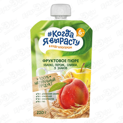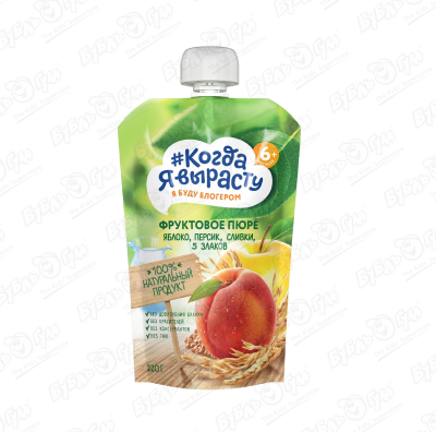 Пюре Когда я вырасту 5 злаков яблоко-персик-сливки 220г с 6мес БЗМЖ