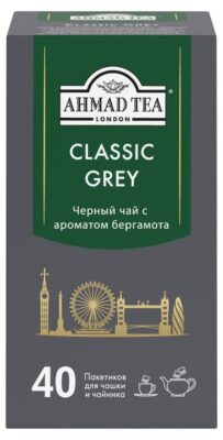 Чашка свежезаваренного чая Классик Грей идеальное сочетание мягкого вкуса, аромата, цвета и крепости. Строгий классический вкус бергамота вносит завершающую ноту в звучание букета эксклюзивных сортов черного чая в совершенном исполнении Ahmad Tea. Прекрасный чай для любого времени дня. В пакетиках Ahmad Tea используется только листовой измельченный чай высшего качества. Истинный ценитель чая знает, что в основе разнообразия вкусов от Ahmad Tea всегда лежит безупречное качество чая. Благодаря уникальной системе контроля качества, английская компания Ahmad Tea Ltd.