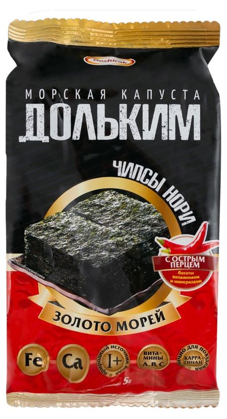 ДольКим это тонкие чипсы из морской капусты с красным перцем. Водоросли собирают, высушивают, нарезают и добавляют смесь растительных масел что делает тонкие пластинки вкусными и хрустящими. Это на 100% натуральный продукт, богатый йодом, железом, кальцием. В комплекте 3 упаковки