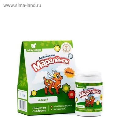 Драже «Алтайский маралёнок» рекомендуется детям для укрепления костной ткани, стимуляции роста и развития организма. В состав входит пантогематоген, который повышает выносливость и укрепляет иммунитет. Это 100 % натуральный продукт без консервантов и вредных добавок.Состав: Сахар-песок, кальция глюконат, патока крахмальная, какао-порошок, валериана лекарственная, листья мяты перечной, трава и листья полыни горькой, ромашка аптечная, шиповника майского плоды, вода питьевая, кислота аскорбиновая, пантогематоген сухой, тальк молотый, масло растительное, воск пчелиный.Суточная рекомендация по применению:3–6 лет — 5 драже;7–11 лет — 7 драже;12–17 лет — 10 драже.Условия хранения: при температуре 18 °C ±3 °C и влажности не более 75 %.Срок годности: 12 месяцев.Масса нетто: 70 г.Количество драже: 145 шт. ±10 шт.Не является лекарством.