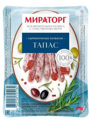 Главная » Продукты,напитки,табак Колбаски сырокопченые Мираторг Тапас, 70 г Просмотров 19 Колбаски выполнены по классической рецептуре с добавлением изысканных специй. Мираторг