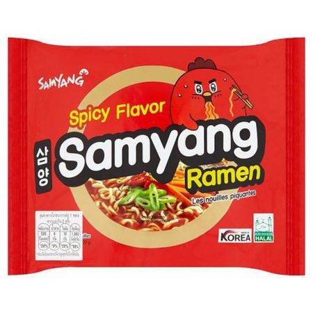 Лапша Samyang Ramen Spicy Flavor острая со вкусом курицы с овощами.Классическая лапша от бренда Samyang с мясным бульоном отлично насыщает и порадует вкусом любителей острого.Лапша прошла сертификацию Халяль КМФ (Комитет Корейской Мусульманской Федерации).Способ приготовления:В 550 мл кипящей воды положите лапшу, приправу и сушеные овощи из пакетиков. Варите все вместе 4-5 минут. Для лучшего вкуса по желанию добавьте свежие овощи и зеленый лук.