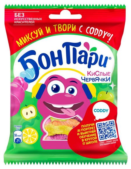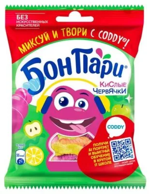 Для изготовления мармелада Бон Пари используются только природные красители, полученные из натуральных компонентов, таких как морковь, перец, шпинат. С фруктовым соком и витамином С. Продукт может содержать орехи, глютен, молоко и диоксид серы.