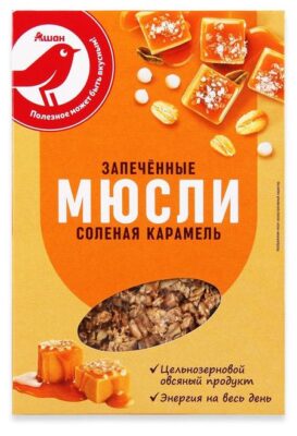 Мюсли запеченые с соленой карамелью АШАН Красная птица — сочетание солёной карамели и воздушных хлопьев, вариант для тех, кто ценит оригинальные сочетания вкуса, а также вкусный и полезный завтрак.