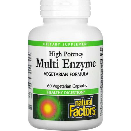 Natural Factors Multi Enzyme High Potency Multiple Enzymes is a complex of plant-based compounds containing enzymes derived from plant or microbial sources such as alpha-amylase, lactase, bromelain, sucrose and proteases that support the digestive system, activate the good bacteria, cleanse and cleanse the colon and detoxify. Features of Natural Factors Multi Enzyme High Potency. Enhance digestive functions. Aids in the metabolism of proteins, fats and carbohydrates. Activates the beneficial bacteria in the digestive system. Helps with detoxification and colon cleansing.