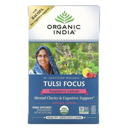 †† Суточная норма не определена. С бакопой для когнитивной поддержкиПоддержка ясности ума Содержит кофеин Растительная добавка Сертификат USDA Organic Сертификат Non-GMO Project VerifiedСертификат B CorporationЗдоровый осознанный образ жизни Без глютенаКошерный продуктВеганский продуктПродукт герметично упакован для сохранения свежестиХаляльный продуктОрганический продукт, сертифицированный Control Union-801983В основе Organic India лежит наше стремление быть живым воплощением любви и осознанности в действии.Восстановительное сельское хозяйствоВосстанавливает здоровую почву и экосистемыУлучшает удержание воды & связывание углеродаВосстанавливает здоровье окружающей средыЗдоровый осознанный образ жизниПочитание взаимосвязанности жизнейМы заботимся о здоровье нашей планеты, наших фермеров, наших сообществ и васТулси — базилик священный Почитается в Индии как «королева трав». Лучшее адаптогенное растениеСнимает стресс & Поднимает настроениеПоддерживает иммунную системуСпособствует естественной детоксикацииЭтот уникальный состав из адаптогенных трав, ноотропных растений и черного чая дополнен кисло-сладкой малиной и лимоном, обеспечивая ежедневную поддержку когнитивных функций. Наша смесь тулси для снятия стресса сочетается с готу колой, ашвагандой, бакопой, шанкпусфи и черным чаем, способствуя спокойствию, ясности ума и сосредоточенности. Попробуйте это со льдом!