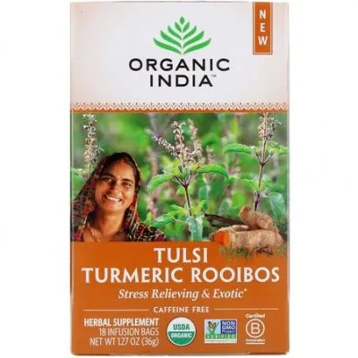 Пищевая ценность Размер порции: 1 пакетик для настоя (8 жидк. Унций) Порций в упаковке: 18 Количество в 1 порции % от суточной нормы Запатентованная органическая смесь 2 г Смесь органической травы тулси (базилика священного) † Базилик священный (Ocimum sanctum) (разновидности Кришна и Рама) (листья) Органический ройбуш (листья) † Органическая куркума (корневище) † Органический имбирь (Zingiber officinale) (корневище) † Органическая корица (Cinnamomum verum) (кора) † Органический черный перец (плоды) † Органический клевер (бутон) † † Суточная норма не определена. Снятие стресса & Экзотический Растительная добавка Сертификат USDA Organic Сертификат Non-GMO Project Verified Сертификат B Corporation Не содержит глютена Кошерный продукт Веганский продукт Продукт герметично упакован для сохранения свежести Халяльный продукт Органический состав сертифицирован Aditi Organic CertificationВ основе Organic India лежит наше стремление быть живым воплощением любви и осознанности в действии.Восстановительное сельское хозяйство Восстановление здоровой и плодородной почвы Поддержка уровня воды и улавливание углерода Восстановление жизни и здоровья окружающей средыЗдоровый осознанный образ жизни Почитание взаимосвязанности жизней Укрепление здоровья — вашего, фермеров и нашей планетыТулсиПочитаемый в Индии как ‘король трав,’ тулси (базилик священный) — адаптогенное растение, известное более 5000 лет. Его применения: Облегчение стресса и повышение настроения Укрепление иммунной системы Поддержка процесса природной детоксикацииРойбуш из тулси и куркумыТулси, ройбуш, куркума с традиционными индийскими специями и оттенком ванили создают насыщенный настой, который согревает пищеварительный огонь.