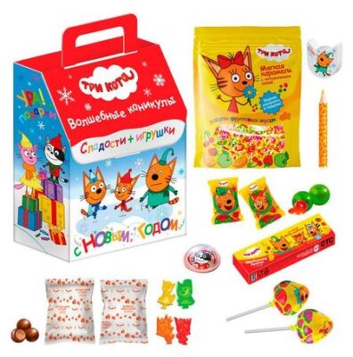 Волшебный новогодний набор Три кота перенесет детей в сказочный мир любимых персонажей! В картонной коробке с ярким дизайном собраны разнообразные кондитерские изделия. Идеально подходит для детского праздника, утренника или в качестве сладкого сюрприза от Деда Мороза.