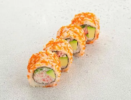 Яркий снаружи и нежный внутри — этот ролл уже давно стал классикой, поэтому мы лишь подобрали лучшие ингредиенты для его максимально качественного исполнения. За нежность во вкусе отвечают снежный краб, спелое авокадо и сочный огурец, за яркий внешний вид — рис в сочетании с икрой тобико.