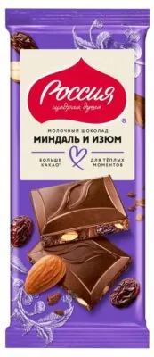 Сложно пройти мимо невероятно популярного сочетания отборного обжаренного миндаля и сочного изюма в шоколаде Россия — Щедрая душа! Молочный шоколад с миндалём и изюмом. Простое, но невероятно вкусное сочетание нежного молочного вкуса, отборных качественных ингредиентов и аппетитной форма шоколада — обещают сладкое гастрономическое удовольствие, а современный яркий дизайн упаковки порадует ваш взгляд.