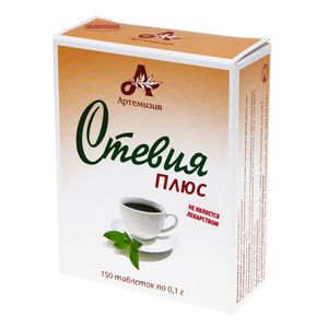 «Стевия плюс» — натуральный сахарозаменитель.Таблетки цвета топленого молока по 100 мг.Входящие в состав таблеток «Стевия плюс» цикорий, стевиозид, глицирризиновая кислота и витамин С регулируют углеводный обмен, снижают уровень глюкозы и холестерина в крови, нормализуют артериальное давление, способствуют росту полезной микрофлоры кишечника, выводят из организма токсины.Экстракт цикория — инулин — является источником органического кремния, который улучшает эластичность сосудов, укрепляет ногти и волосы. Благодаря растворимым волокнам цикория нормализуется кишечная микрофлора и как следствие — укрепляется иммунитет.Экстракт Стевии обладая сладким вкусом не содержит калорий, нормализует уровень сахара и холестерина в крови, снижает до нормы давление, препятствует росту патогенной флоры и как следствие — профилактика кариеса, повышает эластичность сосудов.Экстракт корня Солодки содержит глицирризиновую кислоту, оказывающую противовирусное и противовоспалительное действие, стимулирует выработку собственного инсулина при сахарном диабете, оказывает благотворное действие на слизистые оболочки.Витамин С является незаменимым фактором питания, так как организм человека не способен синтезировать аскорбиновую кислоту. Установлено участие витамина С в метаболизме аминокислот, в транспорте кислорода, в повышении иммунологической реактивности организма; аскорбиновая кислота оказывает влияние на активность ферментов, обеспечивает нормальную проницаемость стенок сосудов, стимулирует антитоксическую функцию печени.