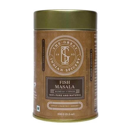 The Great Indian Spicery | Масала для рыбы — Жестяная банка 100 г | Стерилизация паром, Фермерская свежесть, Аутентичная смесь 17 специй, Без примесей | Острый, Землистый