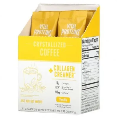 ** Суточная норма не определена. 5 г коллагена ^Изготовлено из рогатого скота травяного откорма, выращенного на пастбище90 мг кофеина ^Просто добавьте горячей воды!Содержит натуральные ароматизаторыНовый режим приема коллагенаНе содержит глютена и молочных продуктовСодержит 8 из 9 незаменимых аминокислотСодержит пептиды бычьего коллагенаУправляйте своим днем с нашими пакетами в стиках с кристаллизованным кофе! Кроме того, в состав этой удобной добавки входит наша добавка Vital Proteins CollagenCreamer® , не содержащая молочных продуктов и глютена, и есть все необходимое для бодрого начала дня. Просто добавьте горячую воду.^ На 1 порцию
