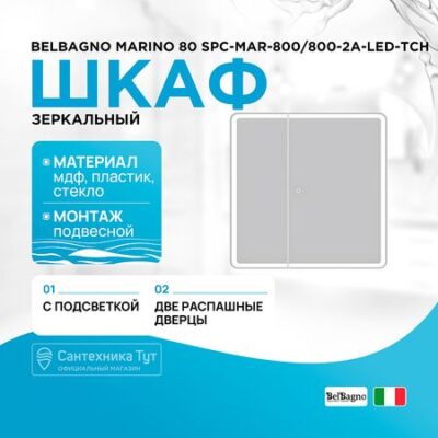 Зеркальный шкаф BelBagno Marino 80 SPC-MAR-800/800-2A-LED-TCH с подсветкой. Характеристики: Цвет: белый. Цвет фурнитуры: хром. Материал корпуса: МДФ.