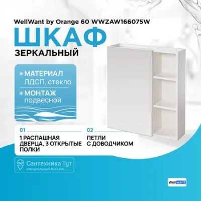 Зеркальный шкаф WellWant by Orange 60 WWZAW166075W. Характеристики: Цвет: белый. Покрытие: матовое. Форма: прямоугольная. Материал корпуса: ЛДСП.