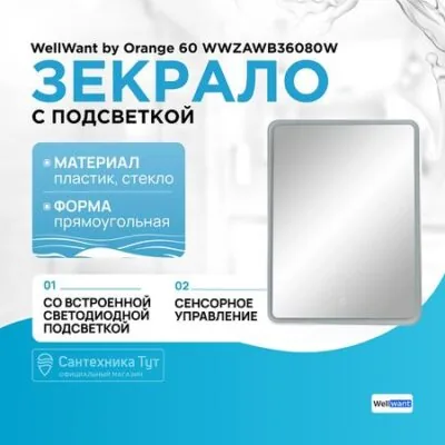 Зеркало WellWant by Orange 60 WWZAWB36080W с подсветкой. Характеристики: Цвет: белый. Материал корпуса: пластик. Размер (ШхВхГ): 600х800х30 мм.