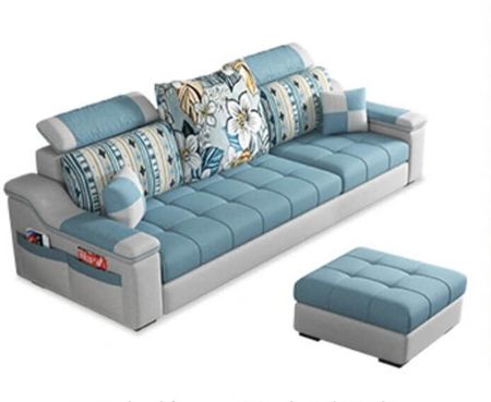 Главная » Мебель Диван трехместный 2,1 м + банкетка для ног Mu Mian, голубой/белый Просмотров 6 Трехместный диван для небольшой гостиной с обивкой из ткани, удобными широкими подлокотниками с карманами и квадратная банкетка. Mu Mian