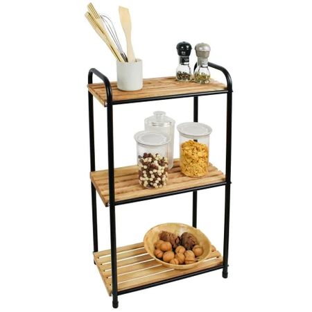 Стеллаж напольный в современный дизайне — это максимальная функциональность и прочность, идеальное решение для организации пространства на Вашей кухне и в ванной, в гостиной и на балконе, а также в любом другом помещении. Каркас выполнен из металла и окрашен в стойкую порошковую краску черного цвета, полки выполнены из натурального дерева. Влагостойкая пропитка полок позволит Вам использовать стеллаж в помещениях с повышенной влажностью.