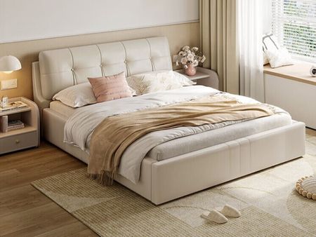 Кровать двухспальная с обивкой из кожи с шириной спального места 1,5 м. Прикроватная тумбочка с открытой полкой и выдвижным ящиком. Матрас для кровати в комплекте.
