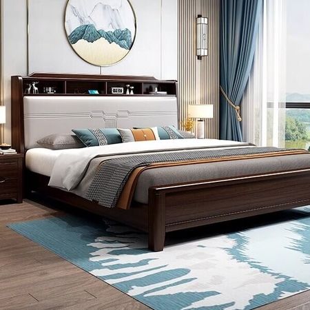 Кровать двухспальная из массива дерева с шириной спального места 1,8 м. Мягкое изголовье с функциональными полками с розетками для зарядных устройств..