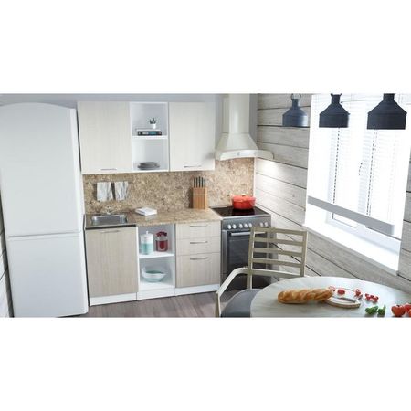 Тип столешницы: Раздельная.Тумба под накладную мойку (Ш × Г × В): 500 × 600 × 850 мм.Рабочий стол (Ш × Г × В): 500 × 600 × 850 мм.Открытый рабочий стол (Ш × Г × В): 400 × 600 × 850 мм.Открытый навесной шкаф, 2 шт. (Ш × Г × В): 400 × 300 × 360 мм.Навесной шкаф с полкой (Ш × Г × В): 500 × 300 × 720 мм.Навесной шкаф под посудосушитель (Ш × Г × В): 500 × 300 × 720 мм.Кухонный гарнитур поставляется в разобранном виде. Инструкция по сборке и необходимая фурнитура входят в комплект.Мойка, смеситель и решётка посудосушителя в комплект не входят.В кухонный гарнитур устанавливается накладная мойка размером 500 × 600 мм.