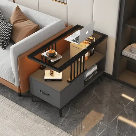 Главная » Мебель Приставной столик Wen Qin, серый Просмотров 5 Приставной столик-тумба для гостиной. Стеклянная верхняя полка-столешница из темно-серого стекла, выдвижной ящик, открытые полки. Wen Qin