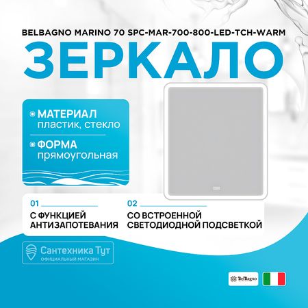 Подвесное зеркало BelBagno Marino 70 SPC-MAR-700-800-LED-TCH-WARM с подсветкой и подогревом, с сенсорным выключателем.