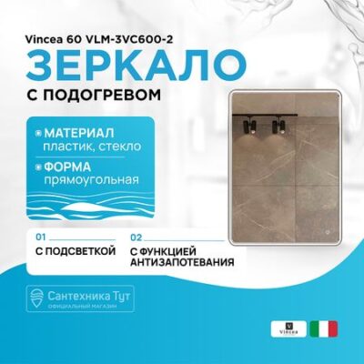 Зеркало Vincea VLM-3VC600-2 с подсветкой, диммером и функцией антизапотевания. Предназначено для использования в ванных комнатах с повышенной влажностью. Соответствует стандартам безопасности.