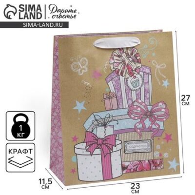 Пакет подарочный крафтовый, упаковка, «Долгожданные подарки», ML 23 х 27 х 11.5 см Дарите Счастье