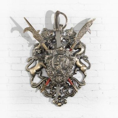Панно с изображением льва на щите и двумя шпагами — это великолепный элемент декора, который привнесет в ваш интерьер нотку благородства и силы.