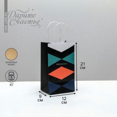 Пакет подарочный крафтовый, упаковка, «Present», 12 х 21 х 9 см Дарите Счастье