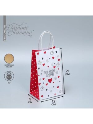 Пакет подарочный крафтовый, упаковка, «Ты в моём сердечке», 12 х 21 х 9 см Дарите Счастье