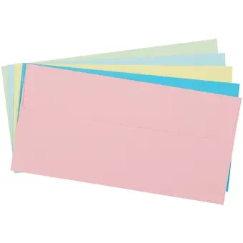 Набор разноцветных подарочных конвертов из плотной бумаги, размер – 110х220 мм. В комплект входит 5 штук. Конверты можно использовать для отправки писем