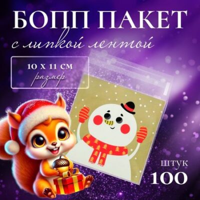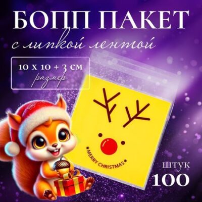 Пакет БОПП с липкой лентой и новогодним дизайном размером 10x10x3 см станет отличным решением для упаковки подарков и сувениров.Он изготовлен из высококачественного