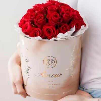 Букет в бежевой шляпной коробке Amour Mini из 31 красной розы (Кения) Standart Семицветик