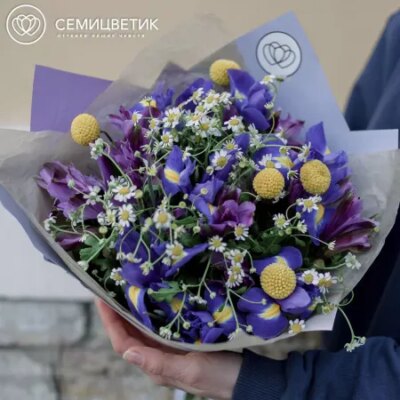 Букет из ирисов, матрикарии и альстромерии в упаковке Семицветик